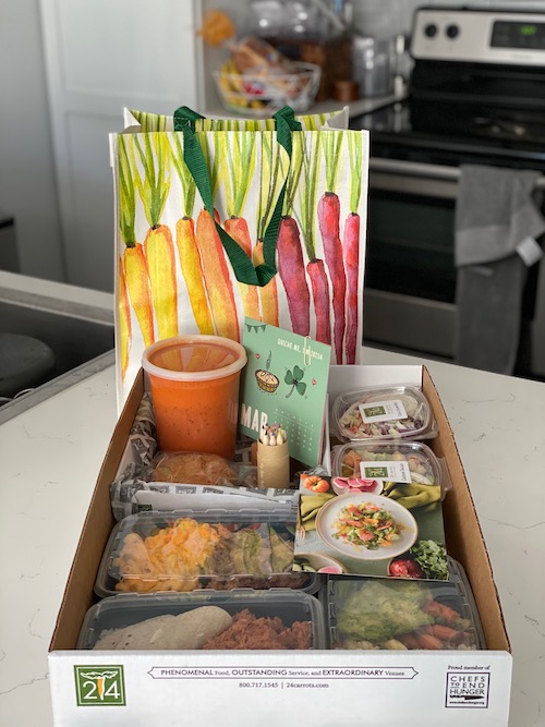 24 Carrots Family Meals feeds four to six. New menus post on Thursdays, with meal options like Prosciutto-wrapped chicken, gnocchi marinara, roasted broccoli, chopped Italian salad and garlic bread ($32/$56). Place orders at info@24carrots.com by 2 pm the day before for delivery or will call.