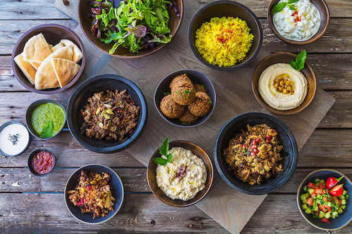 SAJJ Mediterranean’s Feast For 4 ($30), includes falafel, chicken shawarma, rice, hummus, tzatziki, mixed green salad, lentil soup, pita bread and Sajj sauces. Order via the SAJJ Street Eats app.